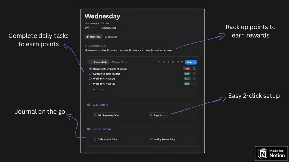 • Focused daily view. Each day has its own page that pulls in time-relevant tasks and your daily tasks. Change daily tasks anytime to build the habits you want.